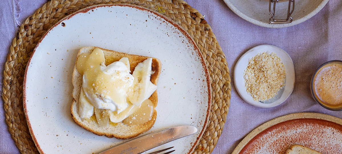 Breakfast bruschetta - banana, yogurt, toasted sesame and honey